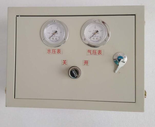 ZPFS氣控式風(fēng)水聯(lián)動噴霧降塵裝置控制箱(以下簡稱控制箱)采用內(nèi)置風(fēng)、水控制閥對裝置用風(fēng)、水壓力進行調(diào)控,對風(fēng)水比例進行均衡,采用氣控閥(控制箱圖片上的“開關(guān)”)控制噴霧裝置的開啟與關(guān)閉??刂葡溟T扇上鑲嵌氣控閥(開關(guān)旋鈕)控制噴霧裝置的開啟與關(guān)閉,鑲嵌有水壓表、氣壓表,分別顯示調(diào)控后的水、氣壓力。
